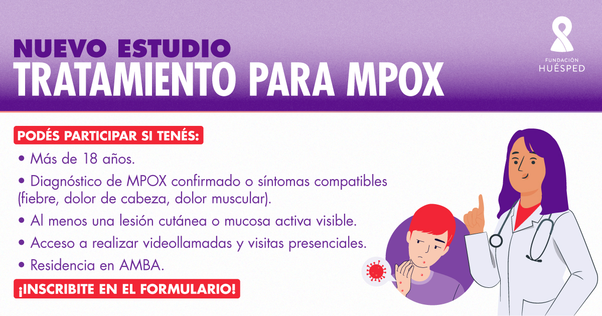 En Fundación Huésped estamos iniciando un estudio para investigar un tratamiento antiviral para MPOX. Queremos probar la eficacia y seguridad de un antiviral llamado Tecovirimat versus placebo en personas con síntomas o diagnóstico confirmado de MPOX Este medicamento ya está aprobado en la Unión Europea y en Estados Unidos, pero no está disponible en nuestro país.
