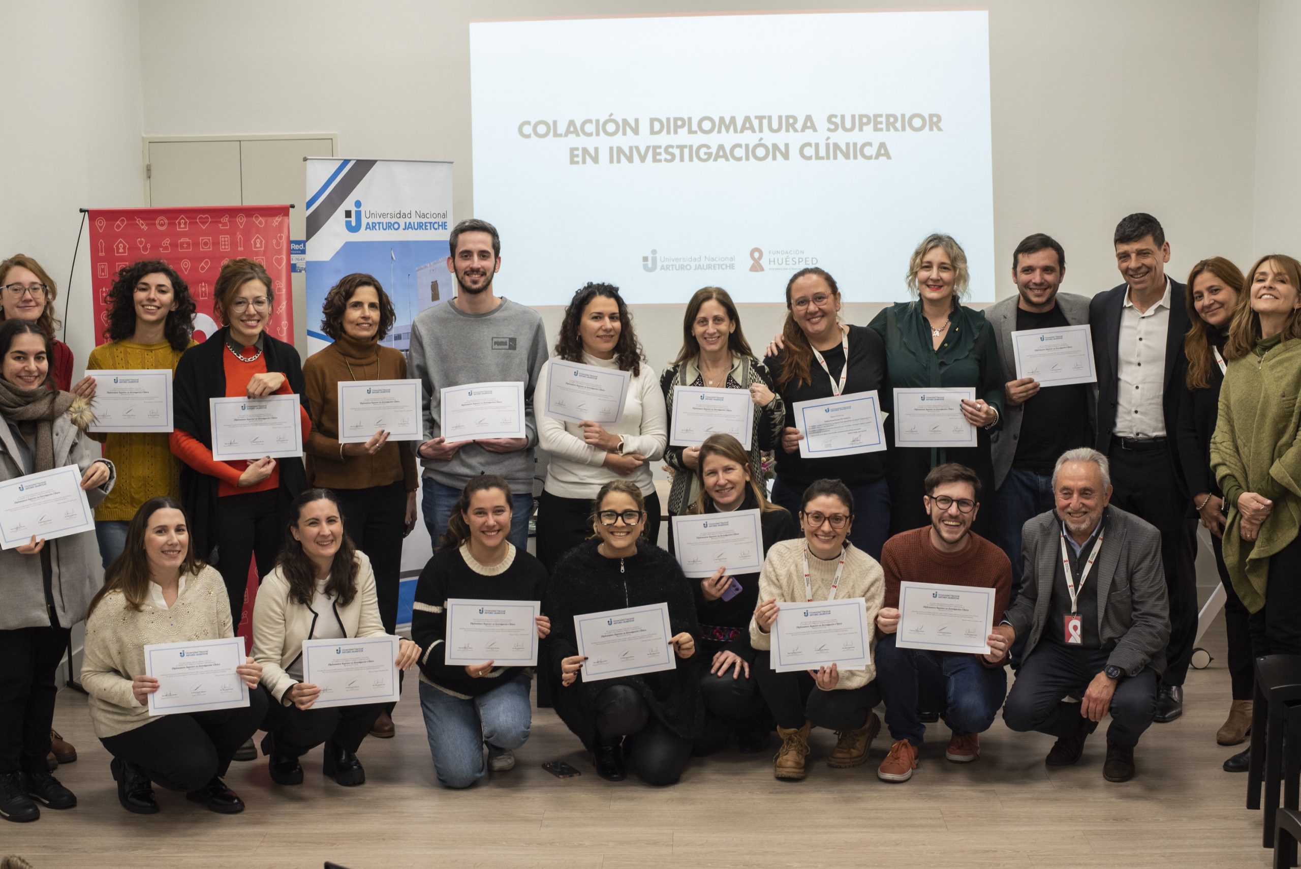 Junto a la Universidad Nacional Arturo Jauretche realizamos una Diplomatura Superior orientada a profesionales que participan en trabajos de investigación clínica para aprender junto a referentes nacionales del campo. La cursada fue una gran experiencia y culminó a pura emoción: el lunes pasado se realizó la colación de Diplomas para la primera cohorte con la entrega especial de Arnaldo Medina, Rector de la UNAJ, y Pedro Cahn, nuestro Director Científico.